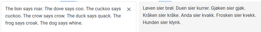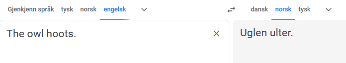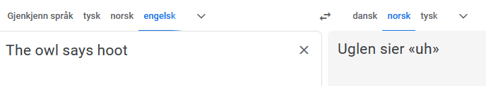 Oversettelsene endrer seg fortløpende når man legger til nye setninger. Det må jo være for å forstå sammenhengen i teksten. Så det er bra — i utgangspunktet. Men her gikk det ikke bra i det hele tatt. GT hadde først «Anda sier kvekk» og «Musa og ekornet sier begge pip», men etter at jeg la til «The owl says hoot» gikk det fullstendig i ball, og den mener også at ugla sier «tulling».