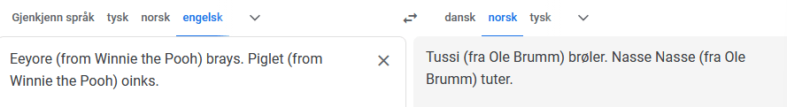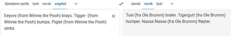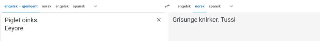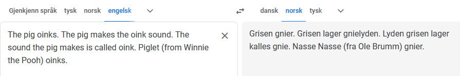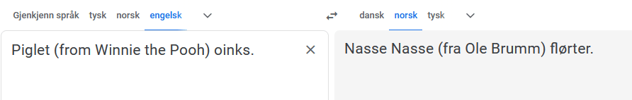 Her har jeg prøvd å hamre inn ordet for å få GTs AI til å forstå sammenhengen. Da fikk jeg meg en ny overraskelse. Nemlig hva GT kaller Nasse Nøff, selv om jeg spesifiserer at det er han fra Ole Brumm. Ole Brumm klarer GT å oversette fra Winnie the Pooh, men ikke bestevennen Piglet.