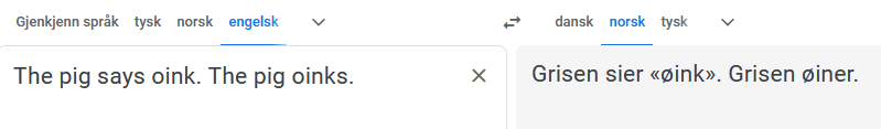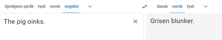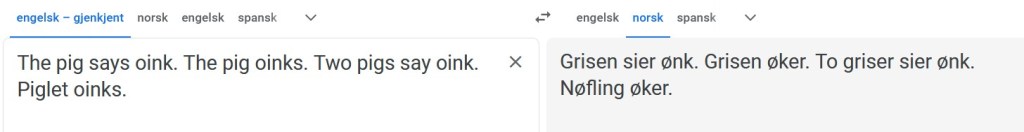 Oink skjønner GT virkelig ikke. På et tidspunkt oversatte den «oink» med «øyp». Heller ikke da jeg prøvde å forenkle oink til et verb, mestret GT det på noen som helst måte.