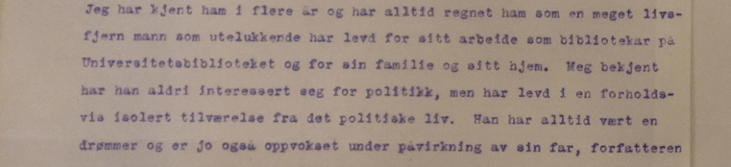 Hvorfor kunne han finne på å melde seg inn i Nasjonal Samling? «Han har alltid vært en drømmer og er jo også oppvokset under påvirkning av» sine foreldre, to av Norges mest kjente forfattere. Det var ikke alltid emosjonelt stabilt. «Han er eneste barn, og hans oppdragelse har vel vært sterkt påvirket av sine foreldres livssyn og forfattervirksomhet».
