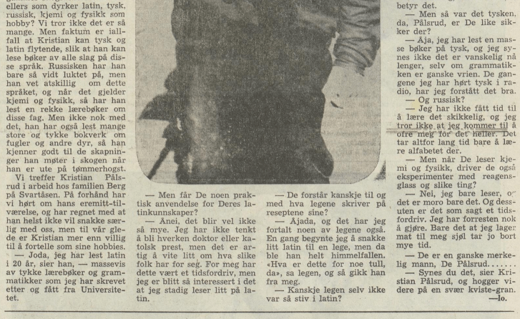 28. september 1962 skreiv Dagningen om en eldre skogsarbeider som lærte seg tysk og latin — sistnevnte litt mer imponerende enn førstnevnte. Han var enslig og trengte et tidsfordriv, og radio og annet moderne hadde ikke den hele sterke appellen. At han bodde ganske ulendt til gjorde at TV forsvant ut av bildet. Men svaret han ga på hvorfor han leste ting som latin, er av de bedre: «Jeg har ikke tenkt å bli hverken doktor eller katolsk prest, men det er artig å vite litt om hva slike folk har for seg». Litt ville han vite, men det måtte ikke gå for langt heller, som for eksempel å få vite mer om en katolsk prest sitt virke ved å overvære en katolsk messe. Det hadde han aldri vært på.