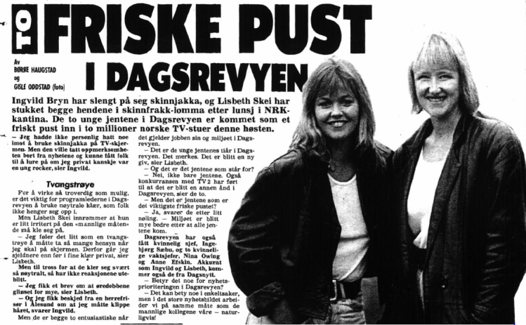 Likevel viser det seg at Skei kom inn i Dagsrevyen høsten 1992, var det som friskt pust, og deler av VG-intervju handlet om de kunne bruke skinnjakke også på skjermen. Det kunne de ikke, for da kunne folk trodd de «var en ung rocker»!