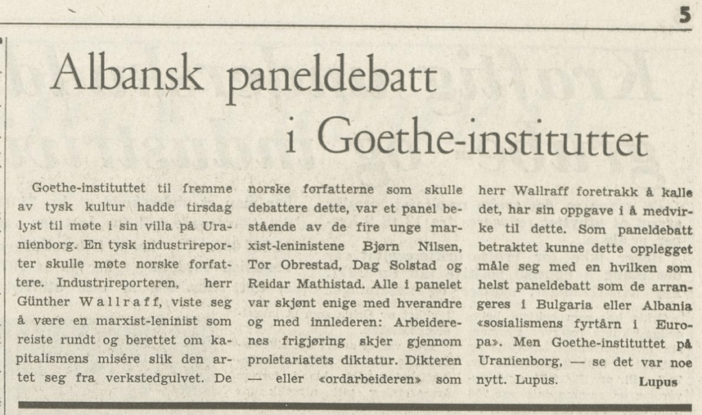 Nå begynte, så vidt jeg kan se, høyreavisene å nevne Wallraff. Aftenposten riktignok kun gjennom annonse. Morgenbladet omtalte panelsamtalen, men da ved siden av forhåndsomtale av «Nesoddiaden». Så det var ikke århundrets begivenhet, men CC sendte likevel en person til samtalen — som antok en viss distanse overfor Wallraff: