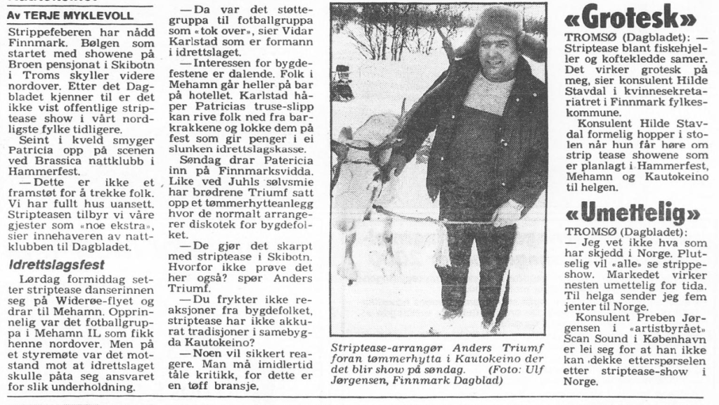 Dette leste leserne av Dagbladet 9. oktober 1987. Var artikkelen mest en unnskyldning for å trykke et toppløsbilde? Bildet var av «yndige Patricia». Jeg har ikke tatt det med, for teksten er tantaliserende nok som den er: Yndige! Utrolig datert… Strippe på idrettslagsfest! Kaste klærne for samene!