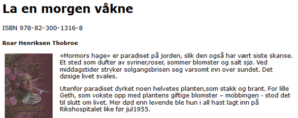 Hva med innholdet: «I 1993 fikk Geths familie billighetserstatning av Stortinget på grunn av mange år med trakassering. Store avisoppslag fortalte om en kommune som mobbet. I stedet for å møte familien med utstrakt hånd, fraskrev kommunen seg alt ansvar og beskrev forfatteren av denne boken som «ensidig», «subjektiv», «provoserende», «ærekrenkende», «ondsinnet», «kvalifisert infam», «klart injurierende» og «direkte kverulerende».