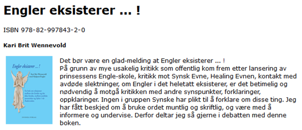 «På grunn av mye usakelig kritikk som offentlig kom frem etter lansering av prinsessens Engle-skole, kritikk mot Synsk Evne, Healing Evnen, kontakt med avdøde slektninger, om Engler i det heletatt eksisterer, er det betimelig og nødvendig å motgå kritikken med andre synspunkter, forklaringer, oppklaringer».