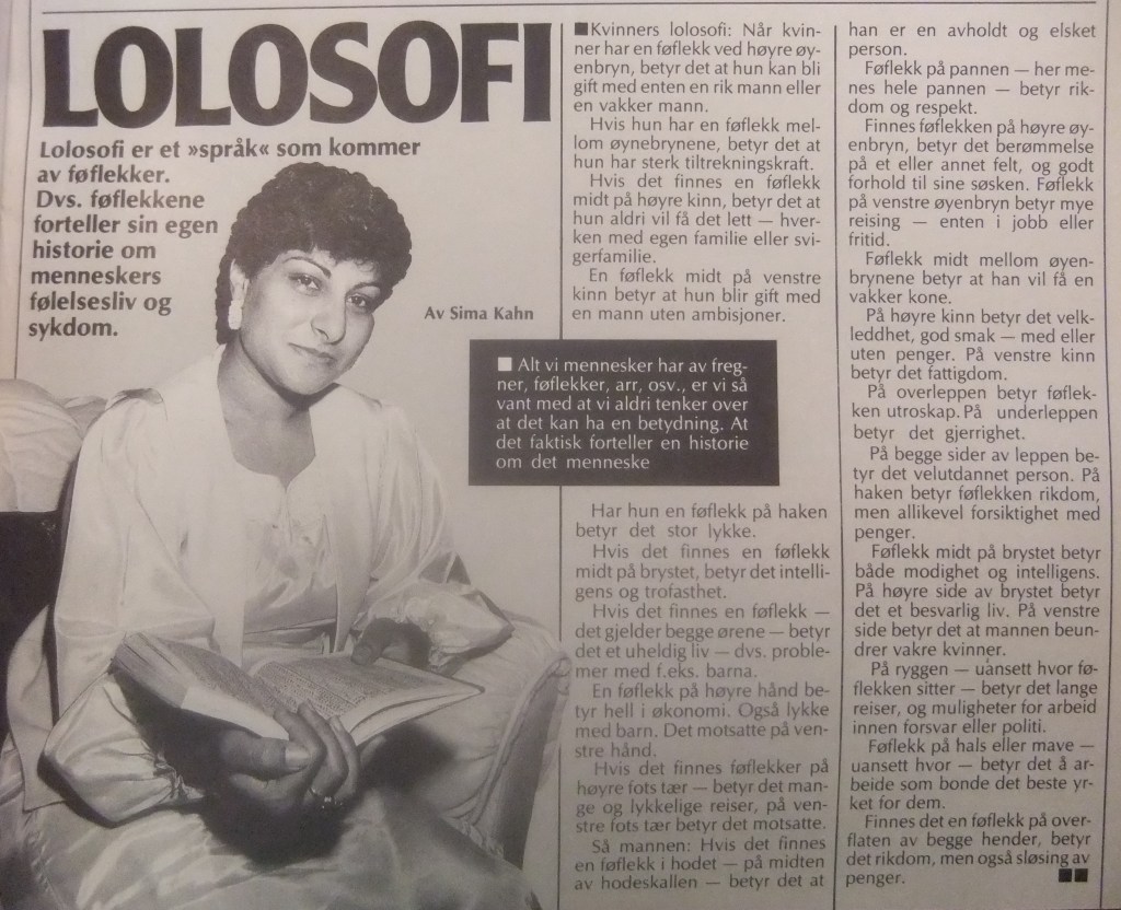 Hun som skreiv om dette var blant annet også drømmetyder. Det står dessverre ikke noe om hva det betyr hvis man har flere føflekker. På høyre håndbak har jeg for eksempel tre, men riktignok bare én på venstre. Noen av spådommene motsier vel også hverandre. At arr «forteller en historie om det menneske» trengte jeg derimot ikke lære, da det er en ganske banal innsikt.
