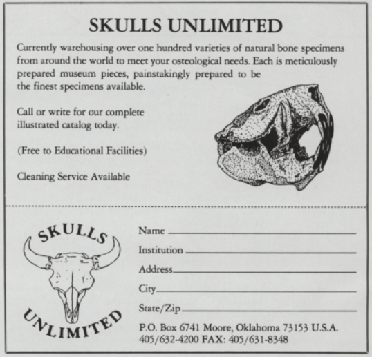 Jeg kom tilfeldigvis over en annonse i et blad fra 1992. Firmaet Skulls Unlimited leverte dyreskaller «to meet your osteological needs». Har ikke du også hatt mange osteologiske behov det siste året?