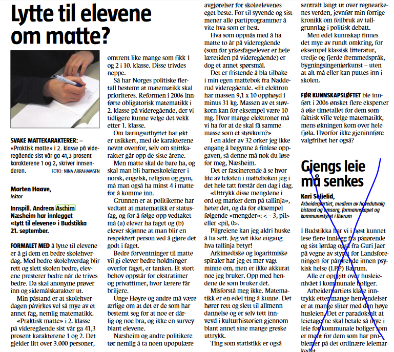 Folk flest veit ikke hvordan det står til med matte i videregående skole. For noen år siden skreiv jeg et innlegg til Budstikka om at mange elever antakelig plages av matte, når 41,3 % på eksamen i 2P-matte våren 2018 fikk karakteren 1 (stryk) eller 2. (Hele innlegget ser du underst.) Debattredaktøren trodde rett og slett ikke på tallet: