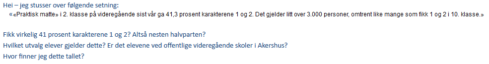 Debattredaktøren ble da overbevist om at dette dessverre er realiteten. Og en ting er sikkert, matten som de har på vgs og som danner grunnlaget for opptak til høyere utdanning, handler ikke om pepperkaker, hoderegning av at prisen i kassa indikerer 3 melk slått inn når du bare kjøpte 2, og den aller mest grunnleggende prosentregning. Dette tilhører grunnskolen. Nei, på vgs driver de med ytterst abstrakte regnestykker som blant annet de jeg viste til ovenfor.