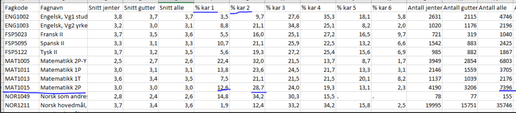Tallet er nasjonalt og ligger fortsatt på https://www.udir.no/globalassets/filer/tall-og-forskning/statistikk/eksamen/videregaende_nasjonalt_2018.xlsx, og her er utdrag tabellen (statistikk, det er matte!). Som du ser gjaldt 41 % på studiespesialiserende linjer, mens yrkesfag 2P-Y hadde over 50 % 1 og 2 på matteeksamen. (Karakteren 1 på eksamen betød at 22,4 % fikk satt en stopper for hele sitt utdanningsløp. De kan verken bli lærere eller noe som helst annet, før de har retta opp i stryket sitt.)