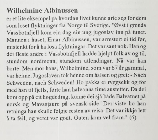 Det andre er at teksten underkommuniserer hva kvinnen egentlig gjorde. Ingen blir motstandskvinne (eller -mann) av å ha hjulpet én person med å flykte. Å påstå det bryter med et av budene for en mer saklig krigshistorie: Vi trenger en mer nøktern omtale av «helter» som ikke overdriver hvor mange motstandsfolk Norge hadde. Jonassen føyer seg inn i den nasjonalheroiske tradisjonen, mens Sveri nevnte at Einar Albinussen var arrestert som los. Da har Wilhelmine antakelig også hjulpet dem som Einar var los for, med mat og kanskje noe utstyr. Så hvorfor sier man ikke det?