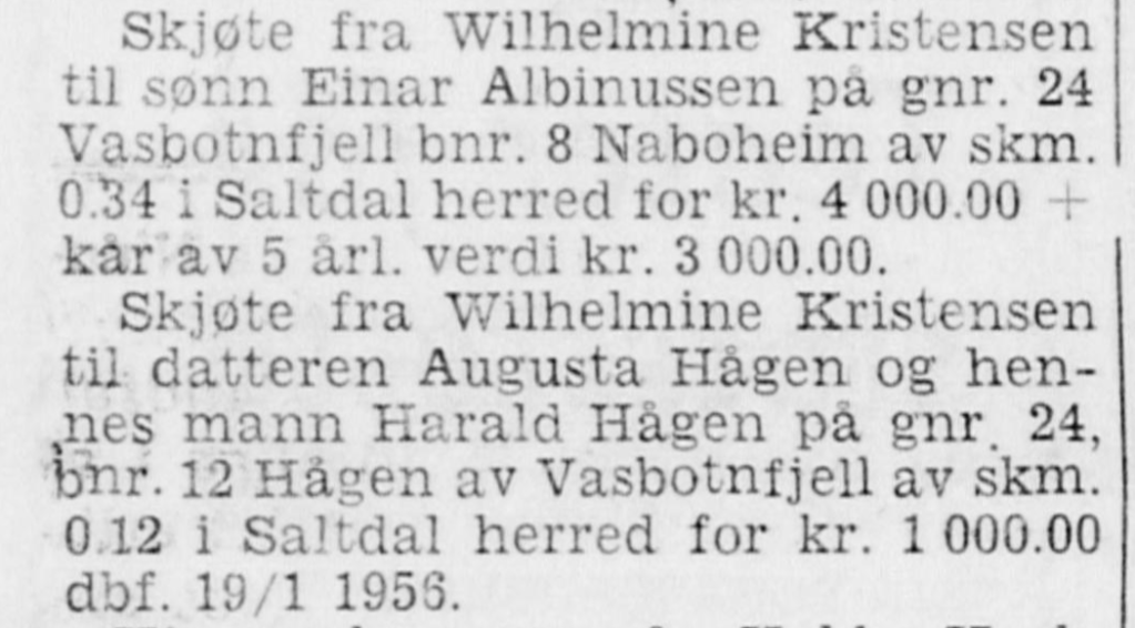 Altså: «Wilhelmine A.» fra Saltdal. Det er i hvert fall noen ting som kan passe. Hvis hun var gift med Einar Albinussen, kan jo navnet Kristensen stamme fra en ny ektemann i ettertid. Men enke var hun ikke, som leveårene for Albinussen viser. Den observante har sett at Sveri omtaler Einar som «mann i huset», men Wilhelmine som «mor hans». Å si som artikkelen gjør, at Wilhelmine var gift med sin sønn, er en grov feil.