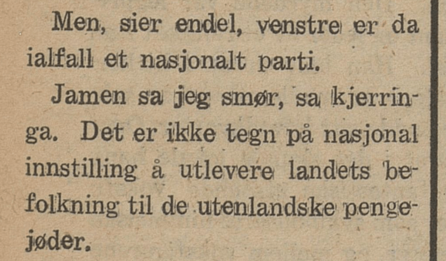 Slik jeg ser det, er et viktig tema i forskningsfronten å behandle antisemittismen som en konspirasjonsteori, som gjerne opptrer sammen med en generell tro på det «alternative». Tronstad har gått mer i bredden enn i dybden (hvor slike sammenhenger ville ha vært å finne). Boka er mer en dokumentasjon som bekrefter lignende undersøkelser fra nyere år: Antisemittismen var mer utbredt enn mange har likt å tro, og få eller ingen politiske retninger var helt frie fra den. Tronstad har altså gjennomgått aviser systematisk, online eller offline. Det er bra, i likhet med at han ikke er redd for å la sørlandske helter som Vilhelm Krag og Gabriel Scott framtre med de antisemittiske utsagn de faktisk kom med. Etter å ha utropt bondepressen til den hyppigste antisemittisme-kolportøren og høyrepressen til den nest hyppigste, oppsummerer Tronstad videre: «Arbeiderpartipressen hadde alltid et annet syn […] og disse avisene kom så å si aldri med negativ omtale av jøder, unntatt hvis det var snakk om jøder som ble ansett for å være rike» (s. 178, se ellers 64-71). Det var lite av det, men likevel mer enn det historikerne før virker å ha trodd – nemlig at arbeiderbevegelsen var vaksinert mot dette. Tronstads beretning virker balansert på dette punktet. Riktignok klarte jeg å finne fire klipp om «pengejøder» i Arendals-avisa Tiden, der Tronstad bare har funnet ett.[1] Det på under 10 minutter.