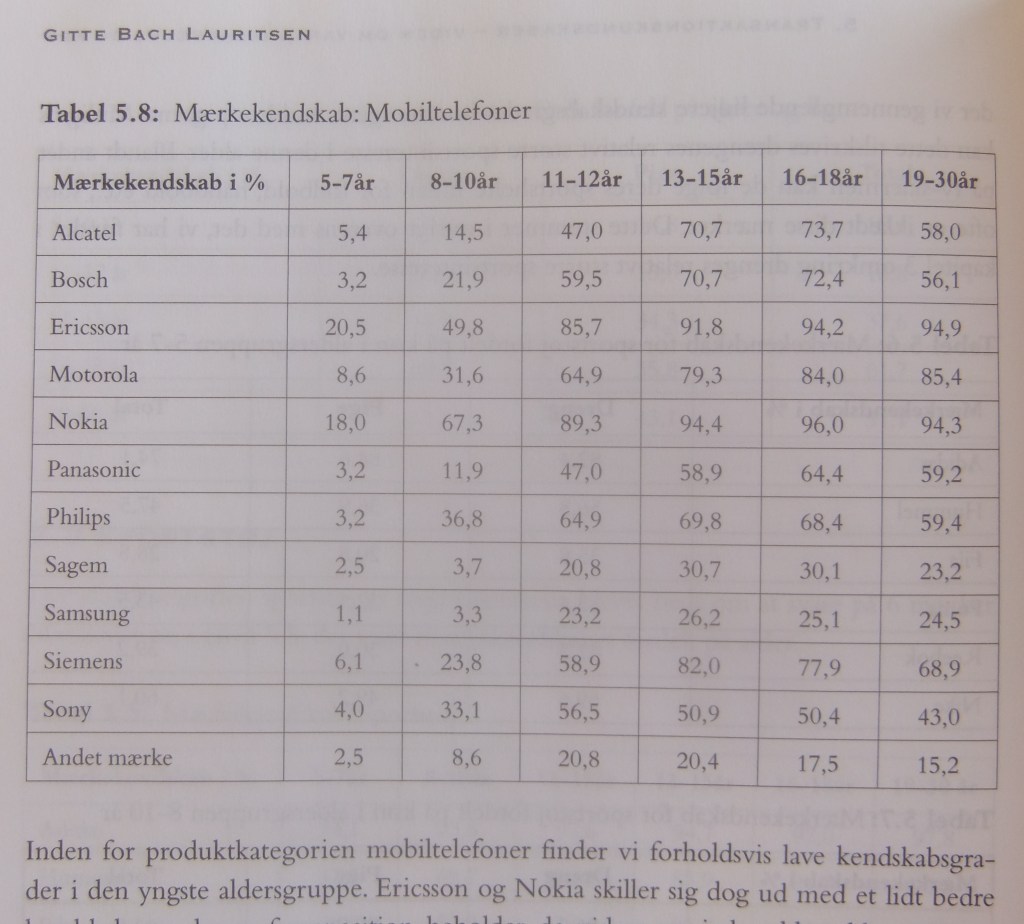 Den gang var Samsung det minst kjente mobilmerket. 1,1 % av de minste barna hadde hørt om det, fulgt av Sagem med 2,5 %. Sikkert like greit at gamlis-telefonen Doro var ikke med i undersøkelsen (s. 144/se bilde).