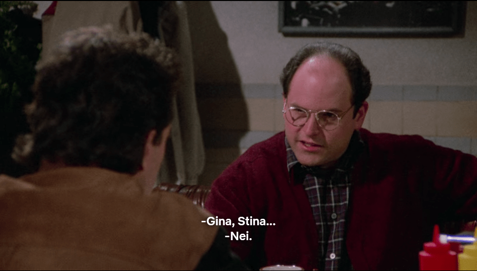 Dette er det dårligste og flaueste jeg har sett av en oversetter. Ikke flaut fordi det er «for intimt», men fordi alle med hørselssans merker at oversettelsene ikke har noe å gjøre med det George Costanza sier, og heller ikke gir mening. Noe av vitsen er nemlig at George bare finner ett ekte navn som rimer på «breast» (altså Celeste), mens oversetteren derimot ramser opp ei rekke ekte navn.