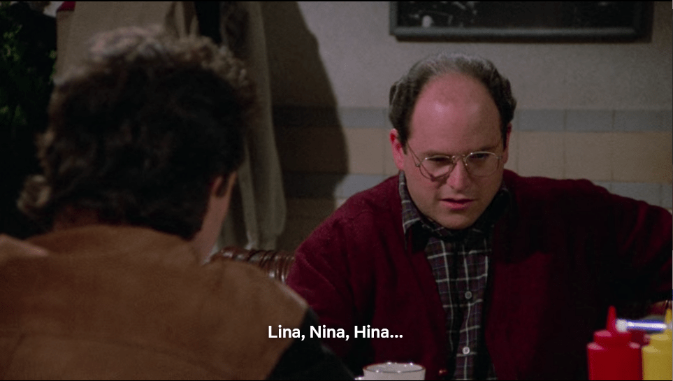 På Seinfeld hooker Jerry opp med ei dame som han ikke husker navnet på. Hun vet ikke at han ikke vet det, men sier at det rimer på «en del av den kvinnelige anatomi». Vel tilbake på kafeteriaen skal Jerry og George ha en liten idémyldring. Hva rimer på kroppsdeler? «Let’s try breast», sier George. Noe som er oversatt til: