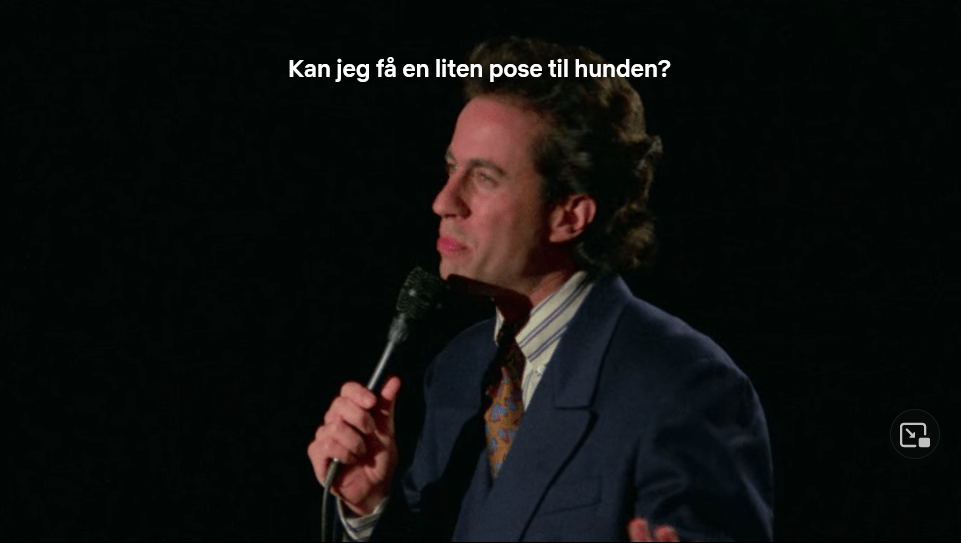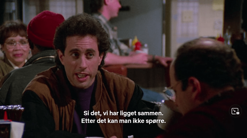 Det er ikke bare innen «det intime» at det svikter for oversetteren, men personen har heller aldri satt sine føtter i en restaurant. Neste episode starter nemlig med replikker som: «I’m sorry, you’re gonna have to give me a doggy bag»