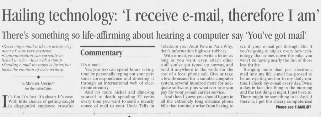 Epost hadde også andre fordeler. Det kunne sendes uten sjanse til å bli «caught in disgruntled employee crossfire». Som Newman innrømmet: «Sometimes».