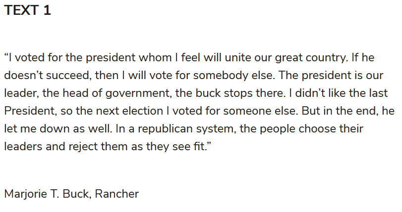 Task 3A på den opprinnelige eksempeleksamen (ikke den reviderte) besto vel også av konstruerte meninger, her fra rancheren Majorie T. Buck som jeg heller ikke tror at eksisterer. (Her hadde Udir også rotet det til i kildehenvisningene.) Dette var som sagt en eksempeloppgave som ble revidert.