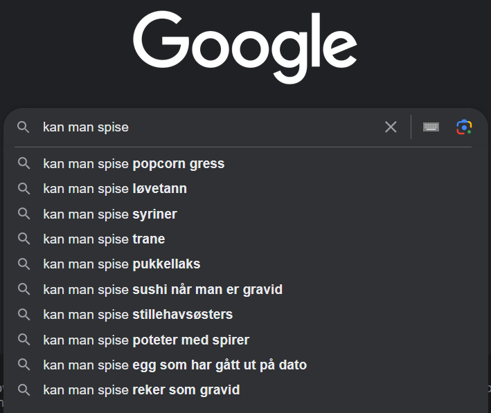 Folk spør Google om hva man kan spise, og Google fullfører setningen for deg. Her skal jeg ta deg gjennom mesteparten av alfabetet.