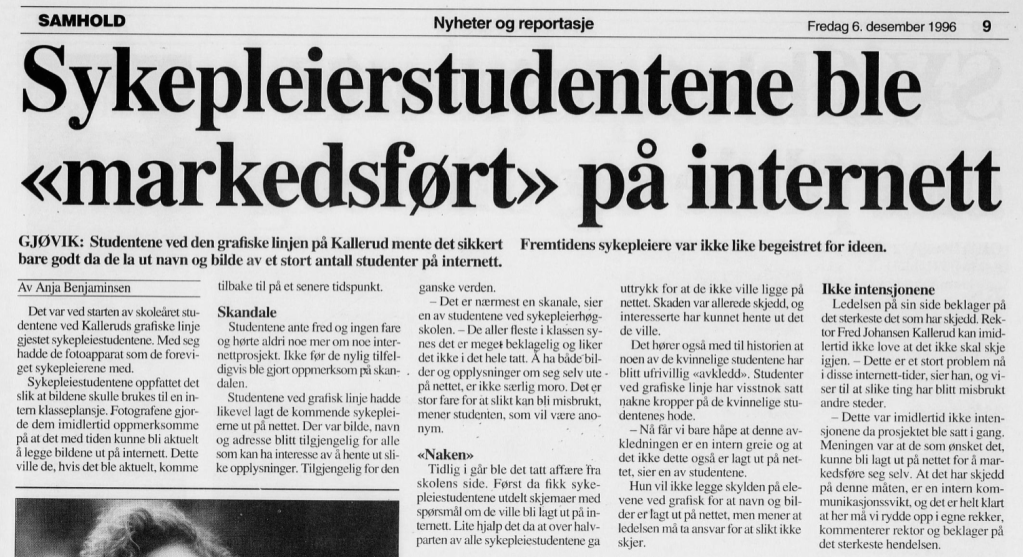 Den andre, og kanskje verre, siden ved saken er altså at grafikk-studentene satt og øvde seg på fotomanipulering, rett og slett ved å lage bruke sine kvinnelige medstudenters hoder i falsk porno. «Nå får vi bare håpe at denne avkledningen er en intern greie og at det ikke dette også er lagt ut på nettet», het det.