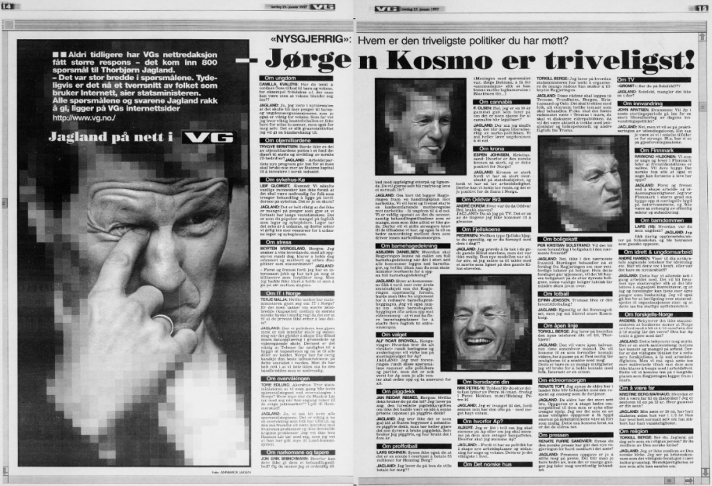 Hvilken handling fra 1997 angret Jagland mest på i ettertid, dette eller å erklært seg som Rosenborg-supporter?** Nettmøter var jo egentlig ikke Jaglands rette element. Han var ikke glad i datamaskiner eller å skrive på tastatur. (Enda selve tastaturet er basert på skrivemaskina som hadde eksistert i hundre år.) Media fikk heller ikke ta bilder av at statsministeren satt og svarte, fordi «det ville bli kaotisk der inne».