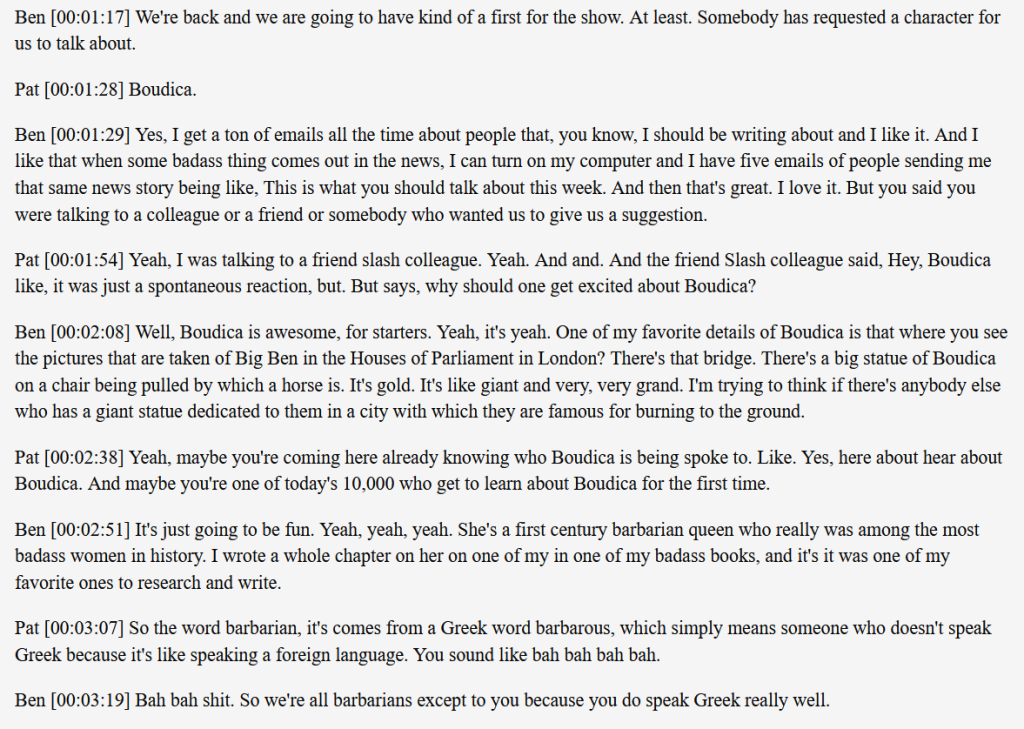 Fordi markedet er større for podkaster, har også BotW blitt det, og innholdet eser ut. Samtidig gjør de oss den tjeneste å transkribere episodene sine selv. Her kommer et utdrag om Boudica, som viser hvor vanskelig de har for å komme til poenget: