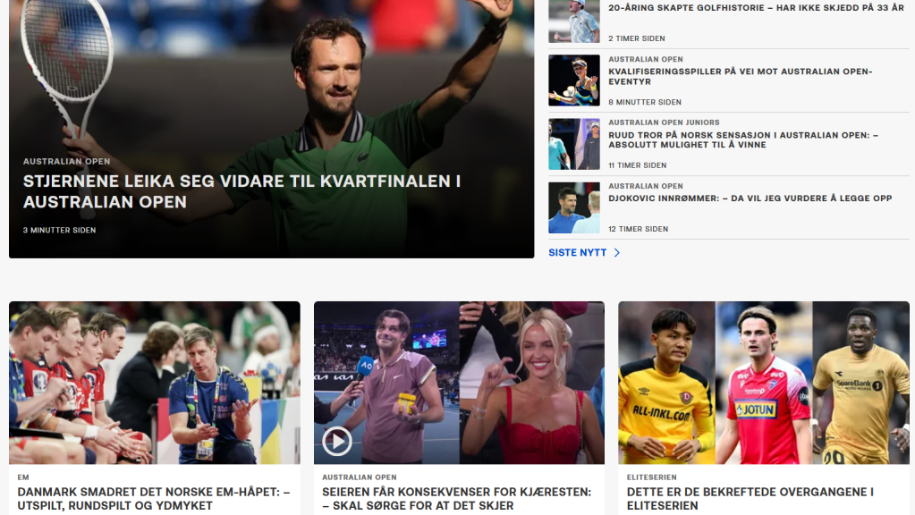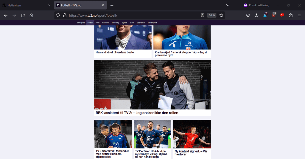 Noen norske medier som er inne på noe av det samme — hva gjelder oppsett i rutenett. Her kontrasterer jeg to nettsider som i bunn og grunn er svært like, i både stoffområde og vinklinger, nemlig TV 2 og Nettavisens fotballsider. Begge står i 100 % over et annet utdrag i min foretrukne størrelse, 50 %. Først TV 2 i full og halv størrelse: