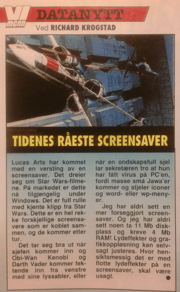 Som bonus, og i forbindelse med at et av kapitlene i boka heter «Da skjermsparere var noe folk satt og så på», legger jeg ved et utklipp av «tidenes råeste» skjermsparer. Med sitt Star Wars-tema var det faktisk «en versting av en screensaver». Hele 4 megabyte RAM trengte vidunderet for å kjøre. (Laptopen jeg skriver dette på, har omlag 8200 megabyte RAM.)