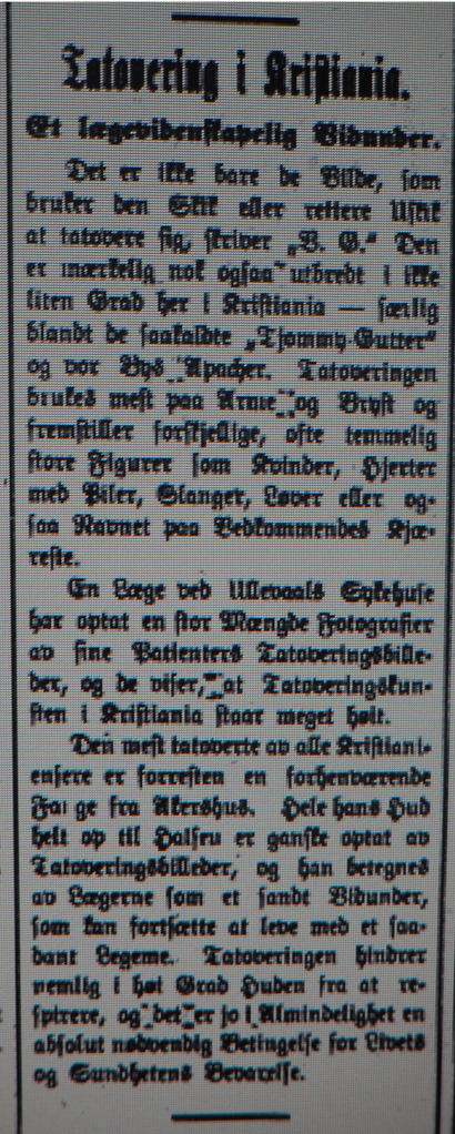 Det er ikke bare de Vilde, som bruker den Skik eller rettere Uskik at tatovere sig, skriver «V. G.» Den er mærkelig nok ogsaa utbredt i ikke liten Grad her i Kristiania — særlig blandt de saakaldte «Tjommy-Gutter» og vor Bys Apacher. Tatoveringen brukes mest paa Arme og Bryst og fremstiller forskjellige, ofte temmelig store Figurer som Kvinder, Hjerter med Piler, Slanger, Løver eller ogsaa Navnet paa Vedkommendes Kjæreste.