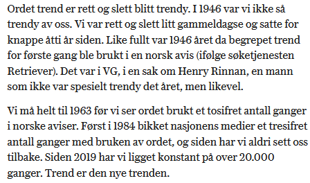 Jeg kan bortimot garantere at begrepet kom fra økonomien. Norges Handels og Sjøfartstidende inneholdt tekster som i sin helhet sto på engelsk, som var språket som populariserte ordet trend. I fortsettelsen ble det brukt i anførselstegn på norsk, og så uten.