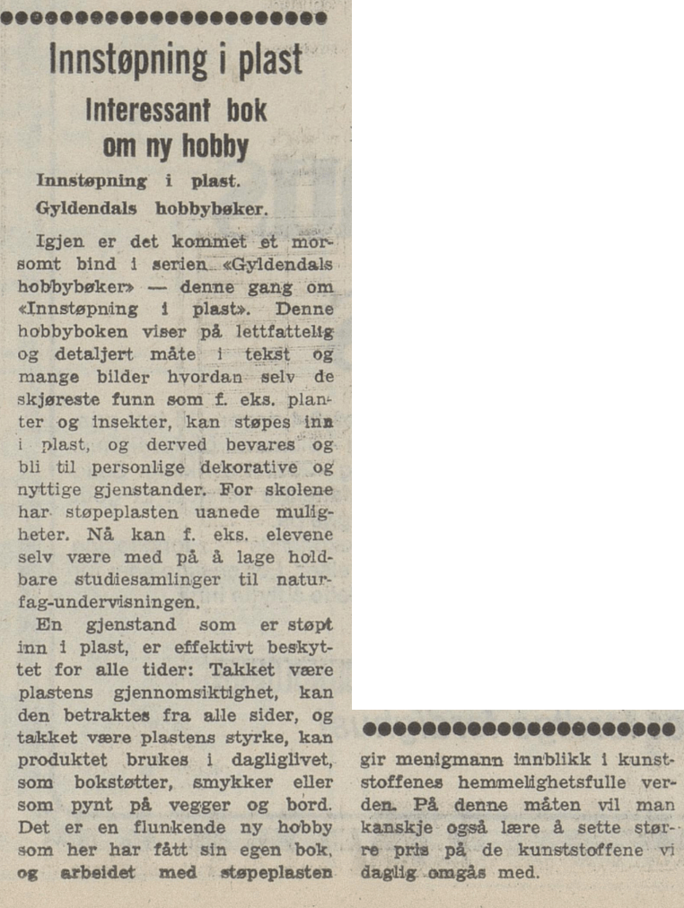 I motsetning til treskjæring og garngreier kan det ikke sies å være noe tradisjonelt over denne hobbyen. I stedet redegjøres det for at sysselen tilhører en vidunderlig ny æra, plast-alderen, og i tråd med dette har bokomtalen med en blomstrende passasje om å sette seg inn i «kunststoffenes hemmelighetsfulle verden». Ja, det er også snakk om å «sette større pris på de kunststoffene vi daglig omgås med». Setter du stor nok pris på de kunststoffene vi daglig omgås med?
