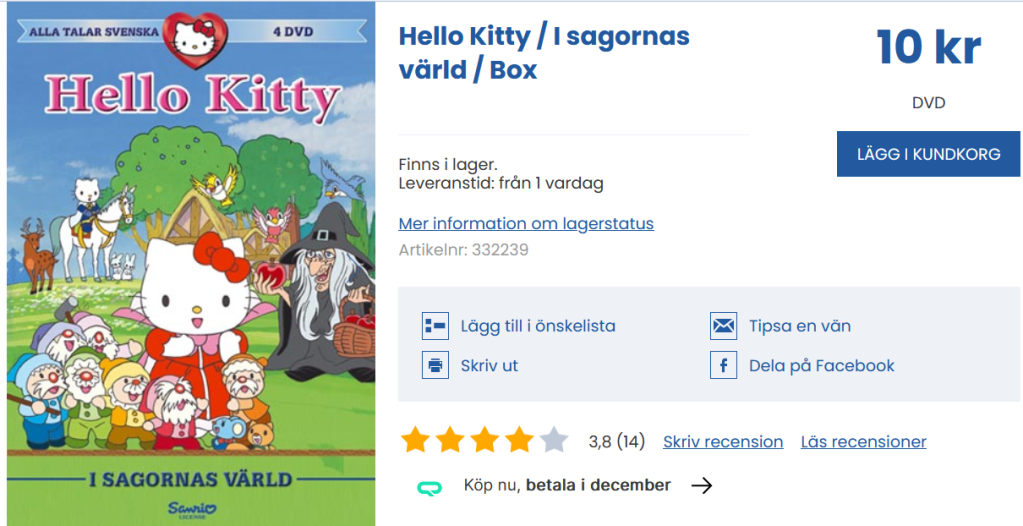 Katalogen (den ikke-visuelle nr. 4/24) inneholder endel varer som ikke stilles ut i butikken, blant annet to sider med filmer som deles inn i kategoriene «lesbian», «straight» og «gladporr». Flere av sistnevnte er «ej textad», opplyses det. Bøkene i katalogen går under kategorien «lettere litteratur», det billigste var et tegneseriealbum til kr 5,-. Men per medfølgende artikkel blir prisen på denne Hello Kitty kvadruppelboksen enda lavere.