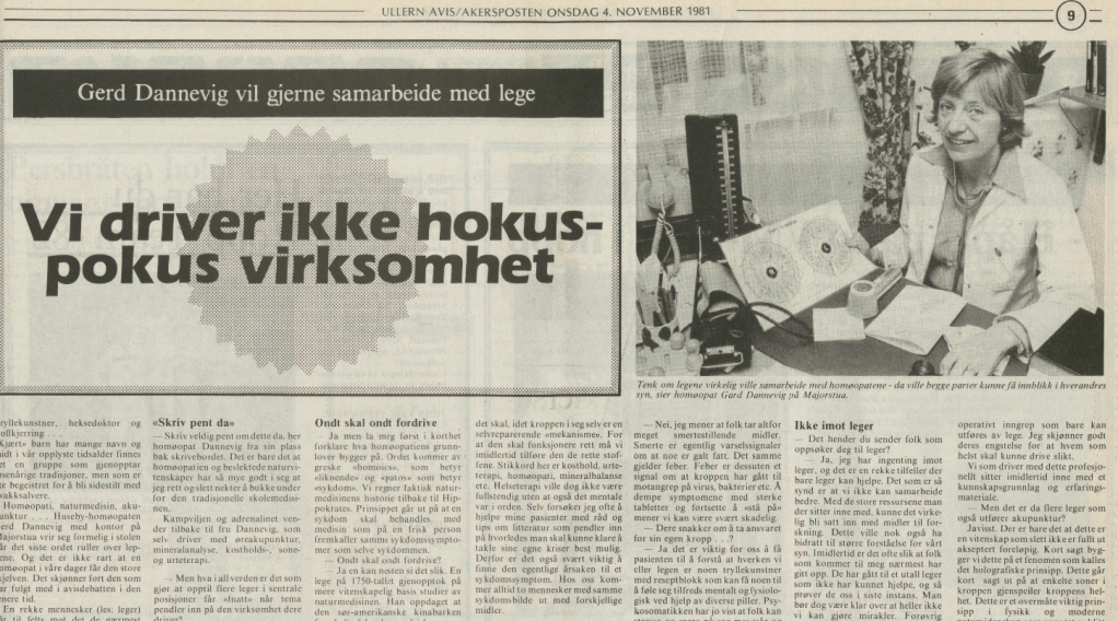 Tidligere var Dannevig homøopat på Oslo vest, viser et søk i avisarkivene. Ovenfor et oppslag fra Ullern Avis/Akersposten i 1981. Til samme avis i 1984 fortalte hun om behovet for vitaminer, urter, for å stresse ned og for helhetlig behandling. Hun satte også øreakupunktur, ifølge en annonse i Dagbladet.