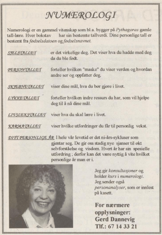 Dannevig tilbød seg også å analysere personer basert på sentrale tall. Disse kunne sendes på kassett.