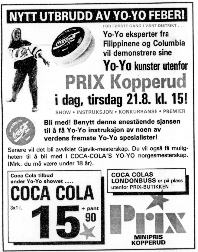 Jojo-feber har slutta å oppstå med fire års mellomrom. Vet ikke om det er noe stort tap, men det ble i hvert fall litt liv og røre da Coca-Cola begynte med turneer og mesterskap i jojo. Og nei, det burde ikke skrives «Yo-Yo». Her fra en annonse for en angivelig historisk begivenhet i Sørbyen, Gjøvik.
