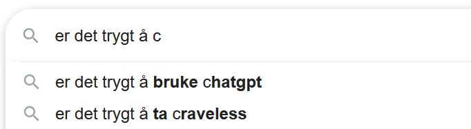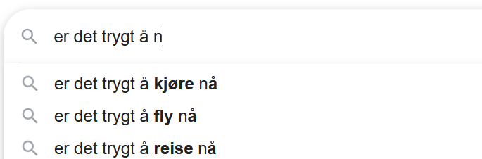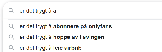 Jeg har tidligere spurt Google om — for å se hva andre spør Google om — det er farlig å gjøre ting, på norsk og engelsk. Nå vil jeg spørre hva som er trygt. Man begynner rett og slett på setningen er det trygt å a, er det trygt å b, og så videre, og lar the G-child fullføre.
