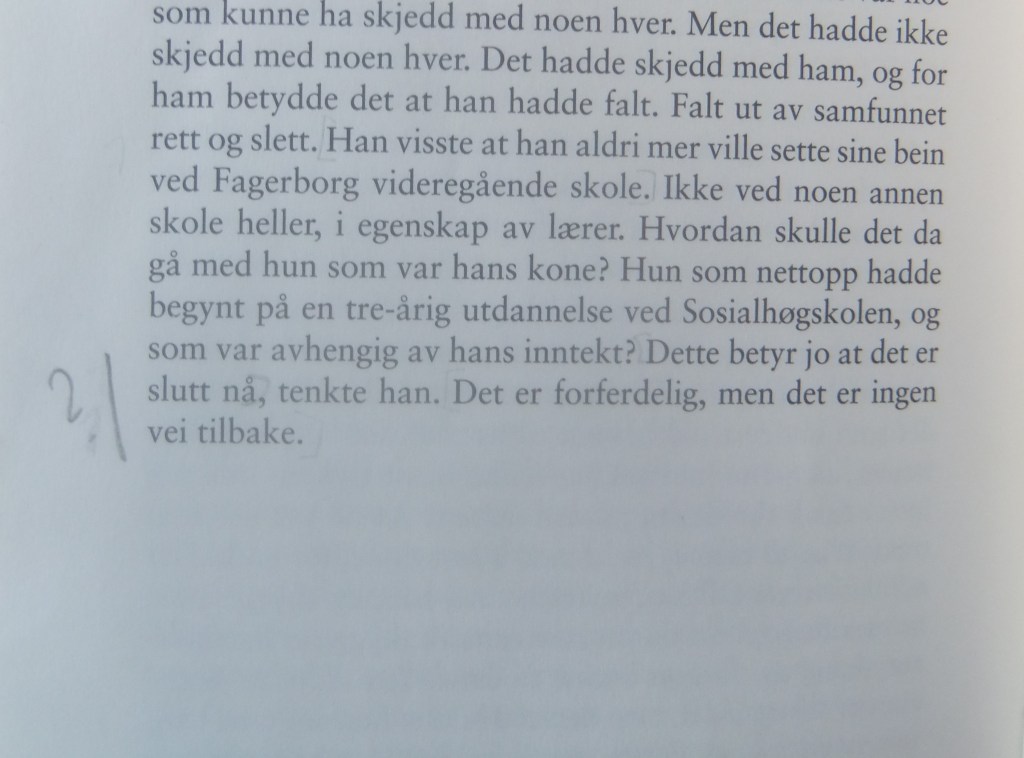 I mitt eksemplar, se under, var det fra før gjort notater i teksten. Ett av notatene var så fint at det må deles med internett, en markering ved siste setning. Rett og slett et spørsmålstegn. Det spørsmålstegnet rommer mye, synes jeg.