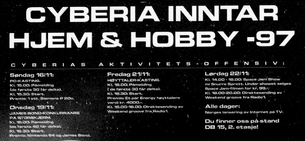 Så også i dette tilfellet, men det leder oss til noe. La oss først se hva Cyberia tilbød på hjem-og-hobby-messa. Cyberia holdt seg på cutting edge i samtida ved å tilby Goldeneye 64 på storskjerm, og storfilmen Space Jam med det jeg tolker som en person i Snurre Sprett-kostyme. Personen holdt et «show» (som må ha inneholdt en form for basketball?). Se også den kryptiske posten: «Norges lansering av Internet på TV». Nyvinningene finner vi på søndag og fredag: PC-kasting og høyttaler-kasting.