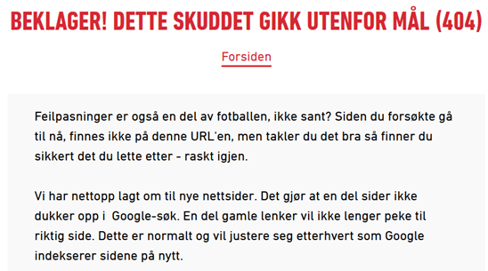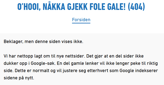 «Vi har nettopp lagt om til nye nettsider. Det gjør at en del sider ikke dukker opp i Google-søk. En del gamle lenker vil ikke lenger peke til riktig side. Dette er normalt og vil justere seg etterhvert som Google indekserer sidene på nytt».