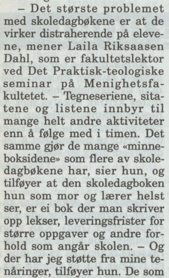 Laila Riksaasen Dahl er pensjonert biskop i Tunsberg. I 1991 hadde hun som misjon å få slutt på trusselen mot den gudegitte orden i klasserommet: skoledagbøker.
