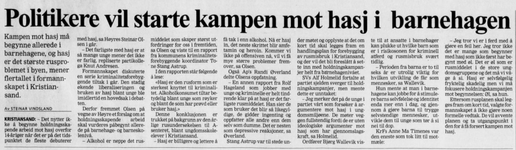 Ønsker jeg at mitt barnehagebarn skal bli fortalt om cannabis? Nei, men det ønsket politikerne i Kristiansand i 1999, egentlig spredt utover hele det politiske spekteret.