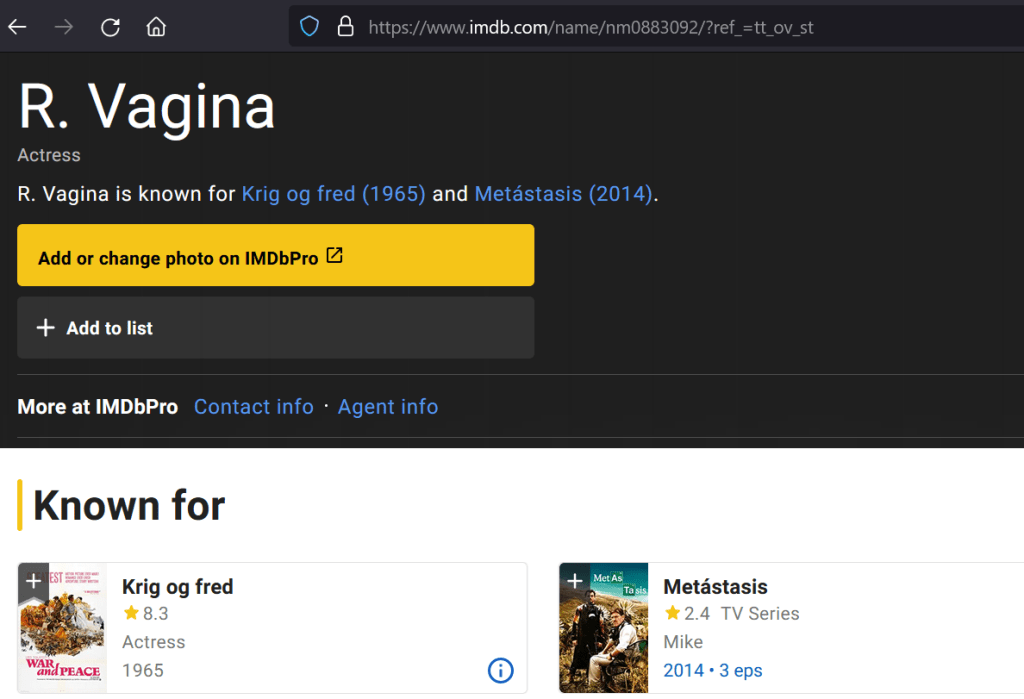 Men har du ikke hørt om gjestestjerna R. Vagina? Ifølge IMDB brer karrieren brer seg over flere tiår, så å kjenne til denne skuespilleren er en viktig kulturell referanse.