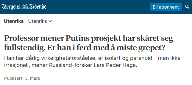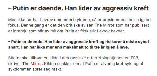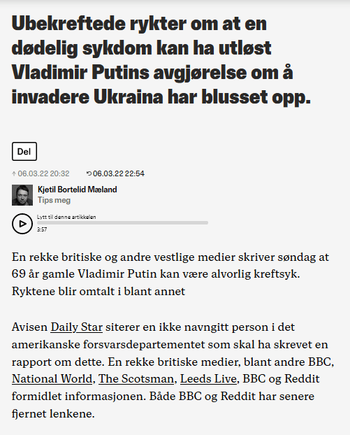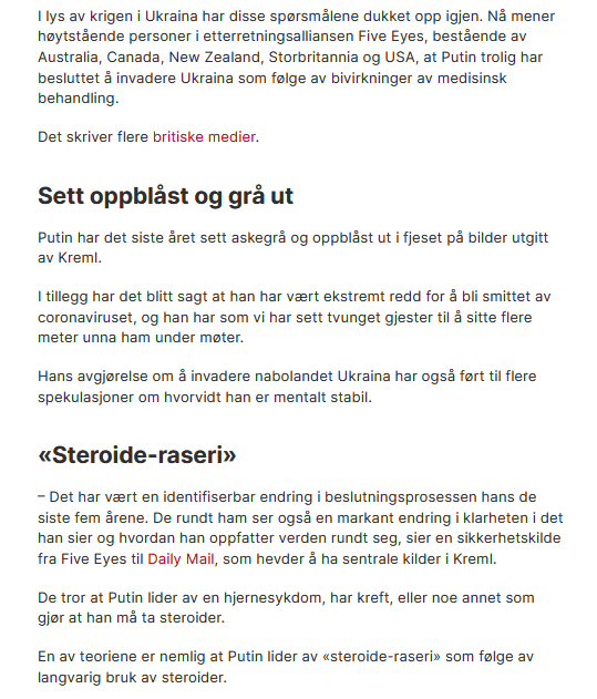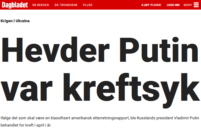 Året 2022 sluttet med «sjokkteori» på Dagbladet.no. Putin var under kreftbehandling, het det, og medisinene påvirket ham til å foreta gale valg. En bivirkningen var psykisk lidelse, megalomani, vrangforestillinger.