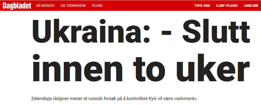 Som resultat skulle uansett Russland tape krigen. Og det fort? Norske medier slo jo også opp påstander om at krigen ville vare i noen uker. Leser man teksten er den uten motforestillinger. Kanskje kan man si at motforestillingene lå mellom linjene, i form av at den ene parten i krigen var kilden.