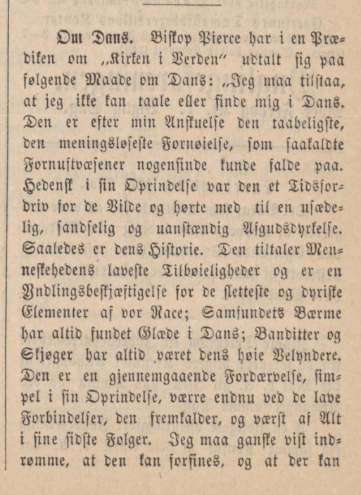Akkurat samme formuleringer står i avisa Andvake. Nå er vi plutselig i 1885, 7. august det året. «Biskop Pierce har i en prædiken om ‘Kirken i verden’ udtalt sig»… Du snakker om nyhetsverdi. Han har uttalt seg, ja, men når? Det var mindre interessant for avisene.